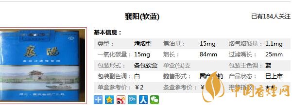襄陽牌香煙在上世紀(jì)80年代,這個(gè)品牌在當(dāng)時(shí)襄樊的招牌,隨著時(shí)間的變化,這個(gè)品牌也是逐漸退出了煙草市場,這也是中國煙草市場不變的定律,后來襄陽煙廠被武漢兼并了,這個(gè)品牌也隨之沒落了,那么在介紹襄陽牌香煙價(jià)格表之前,先來看看這款襄陽牌香煙多少錢一包,這款襄陽(軟藍(lán))的售價(jià)為2元/包。