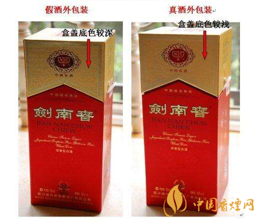 二、重點(diǎn)從商標(biāo)標(biāo)簽上鑒別1、 真品劍南春酒標(biāo)簽主要特征:(1)正標(biāo)標(biāo)簽上“劍南春”三個(gè)字,“注冊(cè)商標(biāo)標(biāo)識(shí)、外花邊”、“jian nan chun chiew”劍南春酒拼音均有凸凹感,印刷套印比較準(zhǔn)確,線(xiàn)條清晰,字體邊緣不毛,輪廓清楚。(2)小字體:酒精度、凈含量、廠名、廠址和簡(jiǎn)介,這些字體很清晰、均勻、無(wú)斷裂,邊緣顏色協(xié)調(diào)。(3)背標(biāo)標(biāo)簽:背標(biāo)標(biāo)簽鑒別主要從簡(jiǎn)介內(nèi)容及印刷字體入手,字體清楚、不毛邊,邊緣顏色協(xié)調(diào)。2、 假冒劍南春酒標(biāo)簽的特點(diǎn)(1) 正標(biāo)標(biāo)簽上凸凹感不明顯;(2)字體套印不準(zhǔn)確,線(xiàn)條不均勻,字體有毛邊和粗細(xì)不勻等現(xiàn)象;(3)小字體不清晰和模糊現(xiàn)象嚴(yán)重;(4)背標(biāo)標(biāo)簽邊緣顏色與背標(biāo)整體不協(xié)調(diào)。