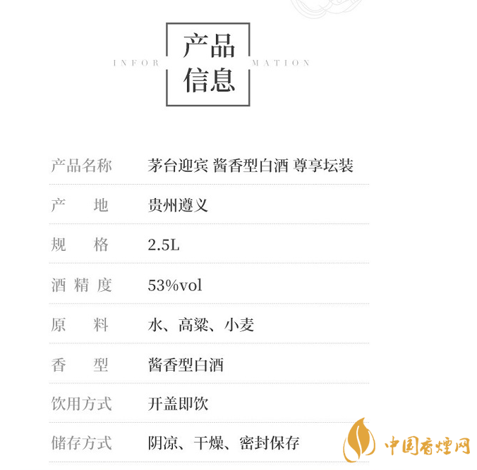 以上是小編整理的有關(guān)茅臺迎賓尊享壇裝多少錢的最新信息,相信在座的朋友們聽到小編的介紹有所認識,但是小編在這里提醒一句以上信息整合于網(wǎng)絡(luò),更多最新最實用的資訊請持續(xù)關(guān)注香煙網(wǎng)。