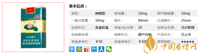 類型 :烤煙型 焦油量 :10mg 煙氣煙堿量 :10mg 一氧化碳量 :10mg