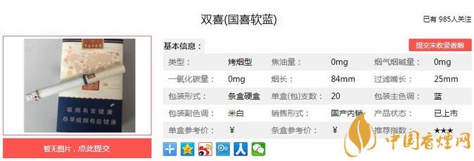 三、雙喜國(guó)喜軟藍(lán)香煙參數(shù)