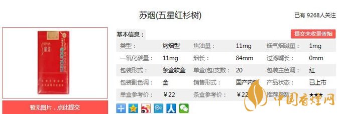 蘇煙五星紅杉樹(shù)產(chǎn)品包裝大膽采用全版電化鋁印刷技術(shù)及橫向的純字體裝飾,外觀設(shè)計(jì)簡(jiǎn)約大方、時(shí)代感強(qiáng),喜慶、大方,與“蘇煙”系列產(chǎn)品風(fēng)格一脈相。經(jīng)香煙網(wǎng)小編市場(chǎng)調(diào)查蘇煙五星紅杉樹(shù)售價(jià)為22元/包。