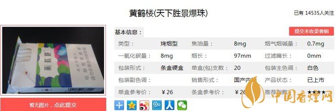 湖北中煙對這種極具中國特色爆珠味道的探索并沒有停止,在他們?nèi)卤楫a(chǎn)品——黃鶴樓(硬天下勝景)中,更是將極具中國風(fēng)味特色的鳳頭姜提取物,作為爆珠添加的天然原料,以此形成的姜味爆珠,成為全國獨(dú)創(chuàng)。經(jīng)香煙網(wǎng)小編市場調(diào)查黃鶴樓天下勝景爆珠售價為26元/包。