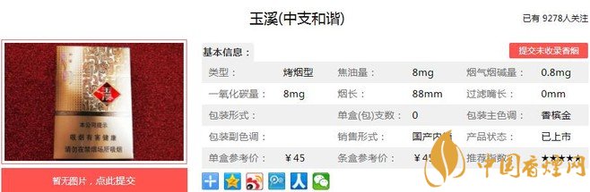 玉溪中支和諧煙支長88mm,煙支是10-10排列的,濾嘴是深棕色,上面印有排列整齊的淡金色小方塊點,爆珠標記是一個小圓點在爆珠一側是貝字,一側是母字。下面我們一起來看玉溪中支和諧的參數信息:焦油量:8mg 煙堿量:0.8mg 一氧化碳量:8mg