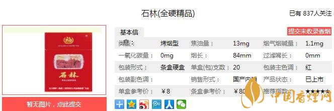 石林全硬精品煙支長(zhǎng)84mm,過(guò)濾嘴長(zhǎng)25mm,使用了獨(dú)特的CPF濾嘴棒,直羅紋盤紙及一系列的新技術(shù)有效降焦。下面我們一起來(lái)看石林全硬精品的參數(shù)信息:焦油量:13mg 煙堿量:1.1mg 一氧化碳量:不詳