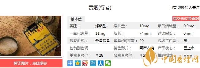 “貴煙(行者)”是“貴煙”旗下的首款短支爆珠煙。煙香不濃不淡,煙草的清香味道,醇正而清新。黃黑配色的醒目包裝、斜條紋帶來(lái)的西部公路感,都在把人引到一種豪放、自由的感覺(jué)之中。經(jīng)香煙網(wǎng)小編市場(chǎng)調(diào)查貴煙行者售價(jià)為28元/包。