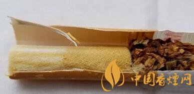 濾嘴是普通的土黃色雪花點水松紙,能看到水松紙上一圈粗粗的降焦孔,從位置看,應該是開在了濾嘴的中段偏下位置。不出預料的話,濾嘴也應該是一段式的醋酸纖維絲束,待會剖開看看就知道了。