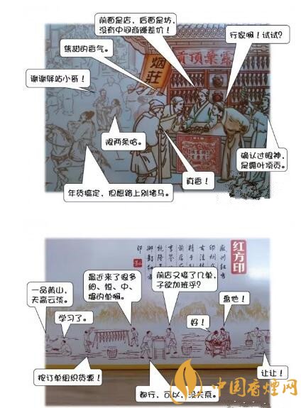細(xì)看,正面的“前店”是一條古徽州商業(yè)街的圖樣,人頭攢動(dòng)、熙熙攘攘,掛著“露葉頂貢”招牌的紅方印煙莊占據(jù)了C位,門口的“文幫”掌柜手持一片煙葉接受眾人圍觀;背面的“后坊”,則描繪了“武幫”的手工匠人們曬煙、制絲的勞作場(chǎng)景??上D案只能繪色、不能繪聲,假如身臨其境,會(huì)聽到什么樣的聲音呢?惡搞一下吧……