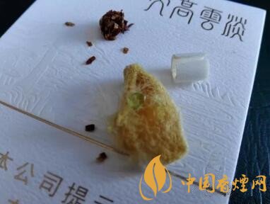 一小段材質(zhì)較硬的過(guò)濾嘴。海綿體內(nèi)包裹著的,是一顆淡綠色的香珠。同時(shí),過(guò)濾嘴紙張內(nèi),附著一層黃色的紙張??傊^(guò)濾嘴里內(nèi)容豐富的很。
