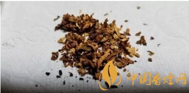 攤開煙絲,明黃的烤煙和暗棕的晾煙比例基本接近1:1。有切得很細碎的煙梗交雜其間??緹煴壤饶β甯绨姹疽愿咭恍?。