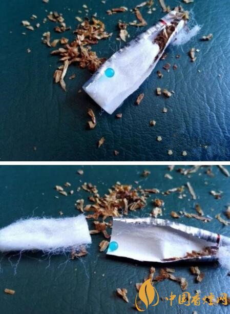 下面兩張圖片,是過濾嘴中內(nèi)置爆珠剪開后的構(gòu)造。爆珠的顏色為藍(lán)色,里面的海綿是一段完整未分離的樣式。