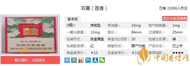 雙喜蓮香煙煙支長84mm,過濾嘴長34mm,煙支呈767排列,煙支設(shè)計簡單清新,淺黃色的煙嘴配上雙喜logo,一朵蓮花襯托在雙喜的logo旁。煙絲色澤深黃,無煙梗,煙葉發(fā)酵程度、膨脹程度合適。下面我們一起來看雙喜蓮香的參數(shù)信息:焦油量:10mg 煙堿量:1.0mg 一氧化碳量:12mg