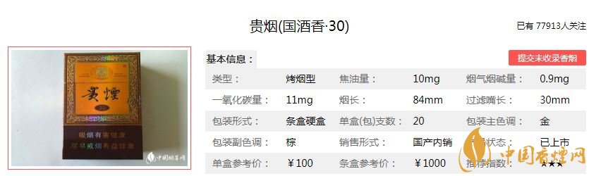 貴煙國酒香30香煙100元/包,這款煙的焦油量:10mg,煙堿量:0.9mg,一氧化碳量:11mg,這款煙抽起來有茅臺(tái)酒的酒香味和煙草的香味,順口,綿而不淡,香而不膩