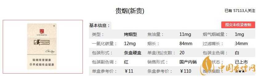 貴煙新貴香煙11元/包,這款煙的焦油含量是11mg,煙氣煙堿含量1.0mg,煙氣一氧化碳含量是12mg,售價(jià)適中,深受煙民最愛,口味清爽,煙勁道足。