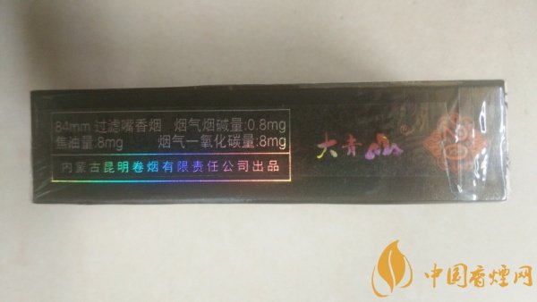 煙盒右側(cè)標(biāo)注著香煙的理化數(shù)值,標(biāo)注著過濾嘴香煙長84mm,0.8mg煙氣煙堿量,8mg焦油量,8mg煙氣一氧化碳量,印有主品牌單位和“云煙”的字樣。