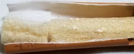 剖開濾嘴...是兩段式濾嘴,前段占據(jù)2/3,絲束里夾雜細(xì)碎的白色顆粒,想來是細(xì)微甜。濾嘴有降焦孔,基本開在了整個(gè)濾嘴的中段位置。從兩段絲束的顏色變化來看,基本均勻,略微變成了淡黃色??磥頍熤У难訜?、空氣的介入等調(diào)節(jié)得都比較理想。香之物。