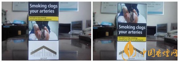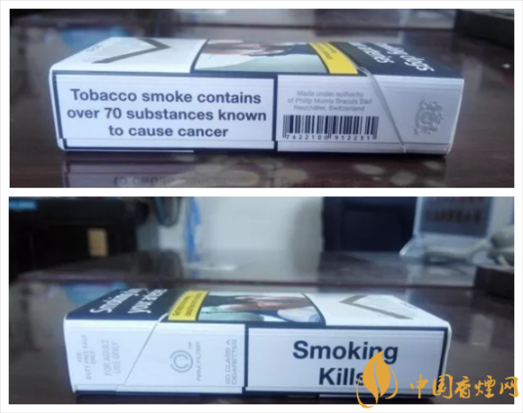 警示圖片的內(nèi)容,與84S紅或白等相同。從樣式上可以看出,它也是一款新版萬寶路。與84S系列相同的,是因為讓位于警示圖片,黑框警示英文字句,轉(zhuǎn)而移到煙盒的左右側(cè)面。#p#副標(biāo)題#e#