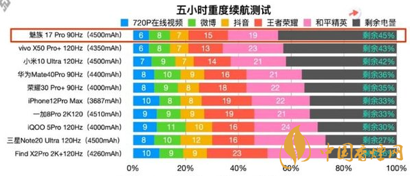 這次測評主要通過對720P在線視頻、刷微博,抖音,打王者榮耀和平精英等日常應(yīng)用進行測試,得出了5G旗艦的五小時重度續(xù)航排名。其中,續(xù)航最好的機型是魅族17 Pro,經(jīng)過五小時的重度測試,該機還剩下45%的電量。