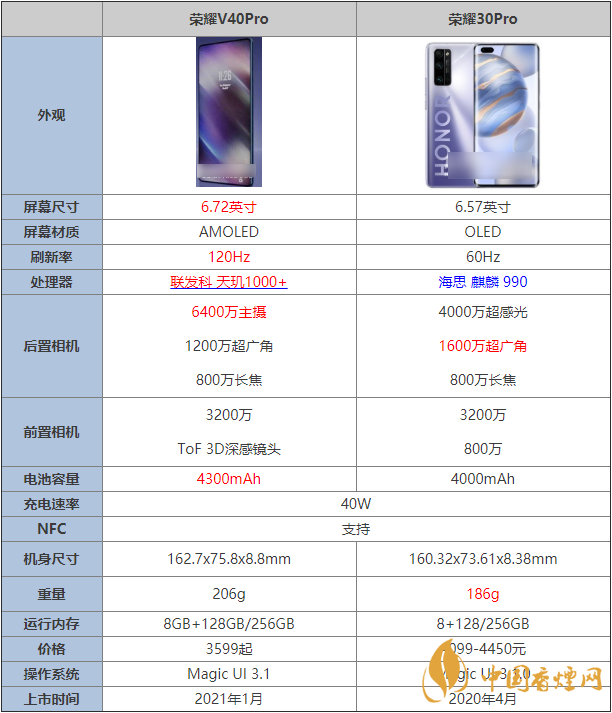 榮耀V40Pro?和榮耀30Pro?:都支持40W有線快充的基礎(chǔ)上,榮耀V40Pro?的4200mAh電池容量更大,為用戶使用帶來更好的電量保障。