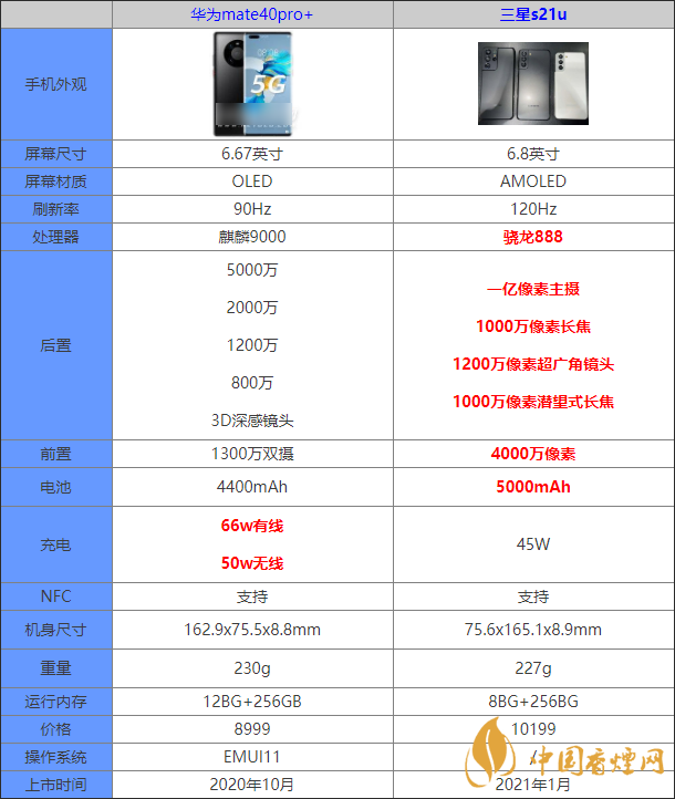 三星s21ultra和華為mate40pro+作為近期新發(fā)手機(jī)中的佼佼者,那么這兩款手機(jī)的區(qū)別是什么?哪款手機(jī)更值得入手?接下來香煙網(wǎng)小編為大家?guī)碜钚碌娜莝21ultra和華為mate40pro+參數(shù)對(duì)比,快來看看吧。