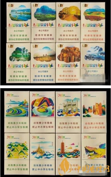 5包裝的云煙•七彩印象,深邃的藍(lán)色外包裝禮盒,滿布各種云南的特色圖紋—大象、蝴蝶、大水車、石林等等,煙包圖案是五城五景,同時(shí)也是五彩五味,分別為:昆明版(玫瑰味)、大理版(梅子味)、麗江版(原味)、西雙版納版(芒果味)和保山版(咖啡味)。