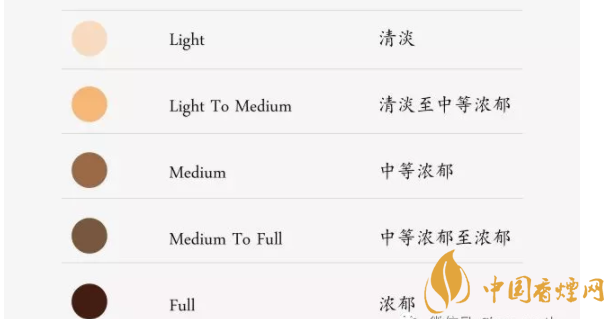 雪茄濃度,是指一支雪茄味道的濃郁程度。在哈伯納斯的官網(wǎng)上對(duì)幾個(gè)主要的雪茄品牌的濃郁程度都有標(biāo)示。一般來(lái)說(shuō),雪茄的濃郁程度,可以劃分為以上5個(gè)檔次: