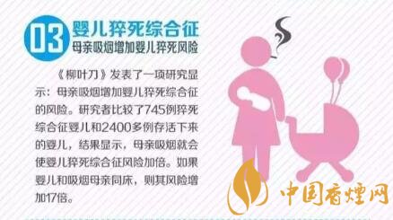 《柳葉刀》發(fā)表了一項研究顯示;母親吸煙增加嬰兒猝死綜合征的風險。研究者比較了745例猝死綜合征嬰兒和2400多例存活下來的嬰兒,結果顯示,母親級煙就會使嬰兒猝死綜合征風險加倍。如果嬰兒和吸煙母親同床,則其風險增加17倍。