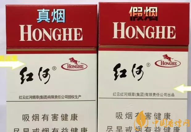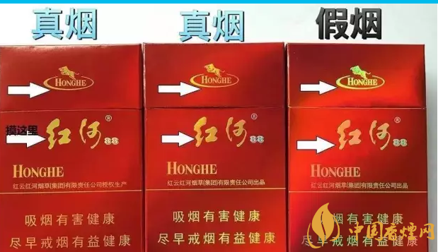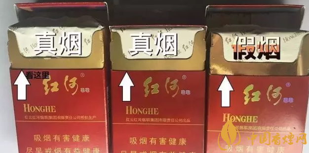真紅河底色純白,假煙泛黃。