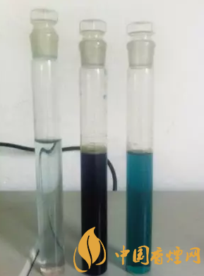 左二黑色瓶為收集煙氣后情況(濃度太高,超出儀器讀數范圍) 左三藍色瓶為經過加水稀釋后做實驗的樣品。