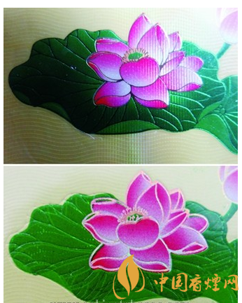 真品小盒正面商標(biāo)紙印刷采用凹凸?fàn)C金技術(shù),其荷花立體感突出,荷花花蕊清晰;假煙多高清晰照相掃描進(jìn)行仿制,套色燙金不準(zhǔn),花蕊模糊,其圖案效果與真品存在明顯差異。