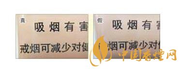 真煙警示語印刷字的邊緣干凈,商標(biāo)紙底色色原點為點狀微小顆粒,印刷細(xì)膩,如警示語第一個“吸”字的最后一筆捺,起筆點是平頭狀;假煙警示語印刷字的邊緣有均勻的鋸齒狀虛邊,商標(biāo)紙底色色原點為不規(guī)則的點,顆粒大,印刷不均勻且粗糙,如警示語第一個“吸”字的最后一筆捺,起筆點是尖頭狀。