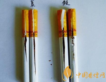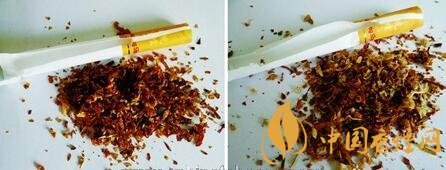真品煙絲摻配均勻,煙絲顏色呈現(xiàn)出金黃色,油潤性好,含煙末少;假煙煙絲劣質(zhì),煙絲顏色為淡黃色,煙絲摻雜質(zhì)多,煙梗煙末多,與真品煙絲結(jié)構(gòu)存在明顯差異。
