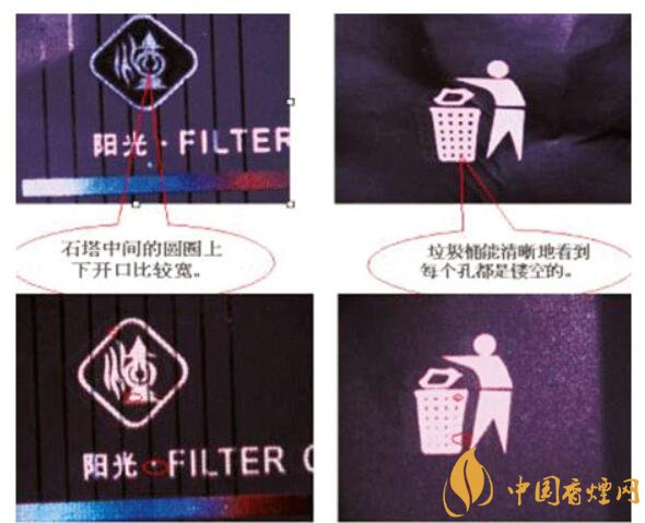 2.真品卷煙小包商標紙圖案中,石塔中間的圓圈上下開口比較寬,而假煙一般開口比較窄。