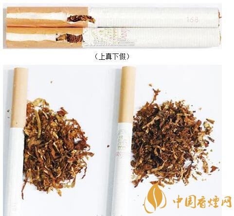 真煙煙支采用單一醋纖濾嘴,長(zhǎng)度為24mm,煙絲切絲寬度均勻,煙絲疏松、光澤油潤(rùn)性好、呈檸檬黃色、含碎末少,煙絲結(jié)構(gòu)為葉絲、膨脹葉絲、膨脹梗絲;假煙煙支過濾嘴較短,長(zhǎng)度約為20mm,制絲工藝粗糙,色澤發(fā)暗無(wú)光澤、煙絲中含碎末較多,大量梗絲未經(jīng)過膨脹處理,一般無(wú)膨脹葉絲,與真品特征存在明顯差異。