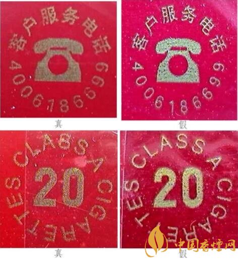 真煙的“ 電話”和“20”標(biāo)識呈現(xiàn)布紋狀;假煙的“電話”和“20”標(biāo)識中沒有紋路,且有漏金。