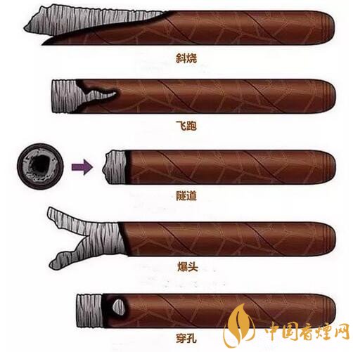 我們抽雪茄的時(shí)候經(jīng)常會(huì)發(fā)現(xiàn)雪茄燃燒出現(xiàn)各種問(wèn)題,這種問(wèn)題我們可以稱(chēng)作是雪茄的不完美燃燒,雪茄的不完美燃燒是日常抽雪茄經(jīng)常會(huì)遇到的。這張圖就展示了我們抽雪茄中經(jīng)常會(huì)遇到的問(wèn)題。