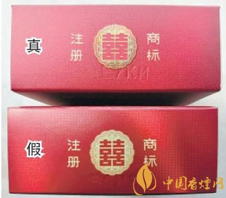 真煙背面中間“花球”激光鐳射立體感強、層次分明、圖案清晰、且“囍”字在花球中間位置;假煙背面中間“花球”激光鐳射無立體感、層次不清、圖案較模糊,且“囍”字明顯偏離中間位置。