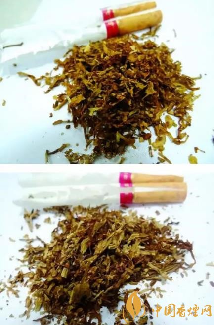 真品煙絲配比均勻,顏色呈現(xiàn)橙黃色,煙絲油潤性強,葉絲有彈性,葉絲摻配比例大;