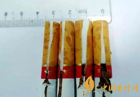 假煙濾嘴棒長度小于2.5cm,不撕破接裝紙判斷時,用手輕捏濾棒長度只到接裝紙金線圈處,與真品煙濾嘴棒長度差異明顯。(左兩支真 右兩支假)