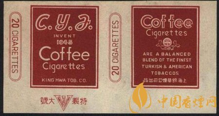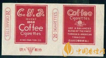 這張煙標在白底色上做文章,正標上是深赭色長方框,正標兩旁印有兩個紅雙線兩端弧形的長方框,內(nèi)寫有紅色“20 CIGARETTES”,即為20支一包的卷煙規(guī)格。副標印有咖啡的英文單詞,其下一個向上半開的花邊圓弧框內(nèi)有個白色圓圈,圈內(nèi)是豎寫的中文字“咖啡”,字體很小,不仔細看難免忽略。副標下半部分則有一段全英文產(chǎn)品介紹“ARE A BALANCED BLEND THE FINEST TURKISH & AMERICAN TOBACCO”,譯為“該產(chǎn)品平和摻入了一流的土耳其和美國煙草。”底部為中文字“錦華煙廠出品”。“Coffee Cigarettes”英文字占據(jù)了整張煙標的大部分空間,絕對奪人眼眸。