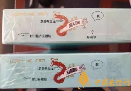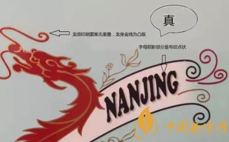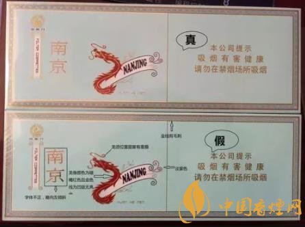 看條盒顏色,真煙為淡藍色,顏色柔和純正;假煙為淺藍色,視覺上顏色不是自然色。看條盒圖標,真煙“南京”二字字體端正清晰,龍須印刷圖案無重疊,龍身金線為凸版,條盒金邊無毛刺;假煙“南京”二字字體向左微傾,龍須有疊痕錯層,龍身顏色為褐紅色、金線為凹版,條盒金邊有毛刺。