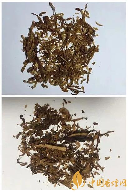 真品卷煙煙絲呈金黃色、絲條狀,煙絲結(jié)構(gòu)為純?nèi)~絲,香氣醇厚;假煙煙絲呈棕黑色,含末量大,煙梗較多,香精氣味濃烈。