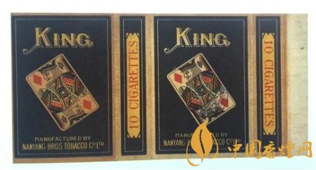 二十世紀三十年代,南洋兄弟煙草公司出品了“王牌”卷煙。這張煙標長146MM,寬74MM。“王牌”即“KING”,撲克牌“K”牌面。該卷煙標正版與副版的圖案一模一樣,煙標中央向左傾斜45度的一張方塊“K”撲克牌,其上寫有大大的金色英文字母“KING”,其下為南洋兄弟煙草公司出品的英譯文。整幅煙標沒有一個中文字,左右騎縫處則各印有紅色的“10 CIGARETTES”,即該卷煙規(guī)格為十支裝。方塊“K”牌面,就是凱撒大帝(朱利葉斯·凱撒),為羅馬共和國終生的執(zhí)政官,后出任高盧總督。四張花色的“K”牌面,南洋公司為何只取其方塊花色呢?因為在四張花色“K”中,只有這張方塊“K”為凱撒大帝手持戰(zhàn)斧的側(cè)面像,其余三張人物均為正面像??赡軓S商是為了標新立異,從中亦能投射出其生產(chǎn)的卷煙與眾不同吧。如此設計的煙標,握于手掌,更像是拿了一副撲克牌,雌雄難辨,頗有玩味。