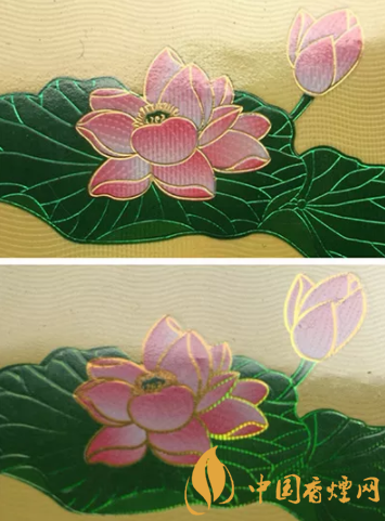 真品卷煙商標(biāo)紙上的荷花花瓣采用漸變技術(shù),顏色由粉紅色向白色過渡,花蕊處金色線條清晰,圖案印刷自然協(xié)調(diào),立體感強(qiáng);假煙采用普通仿制技術(shù),顏色搭配較為死板,花蕊處金色線條模糊、擠成一團(tuán),圖案印刷粗糙、立體感差。