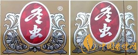 真品卷煙商標(biāo)印刷采用“凹印”,兩種顏色交界邊緣呈現(xiàn)虛邊或鋸齒狀。假冒卷煙商標(biāo)印刷一般采用“膠印”,兩種顏色交界邊緣比較清晰、光滑,無鋸齒狀。(左真右假)