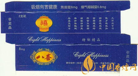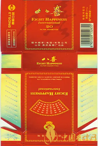 “八喜”香煙高貴典雅的煙標(biāo)裝潢設(shè)計(jì),曾獲得第八屆華東裝潢設(shè)計(jì)大獎(jiǎng)?wù)棺罴褎?chuàng)意獎(jiǎng)。“八喜”香煙問(wèn)世后,青州卷煙廠得知人們很想知道“八喜”具體指哪“八喜”,于是該廠于1999年向社會(huì)廣泛征集吉祥語(yǔ),從中精選出“久旱逢甘霖、他鄉(xiāng)遇故知、洞房花燭夜、金榜題名時(shí)、升官又晉爵、財(cái)源紛紛至、家和體魄健、盡享天倫日”等八句具有代表性的吉祥語(yǔ),作為“八喜”的詮釋和具體所指。