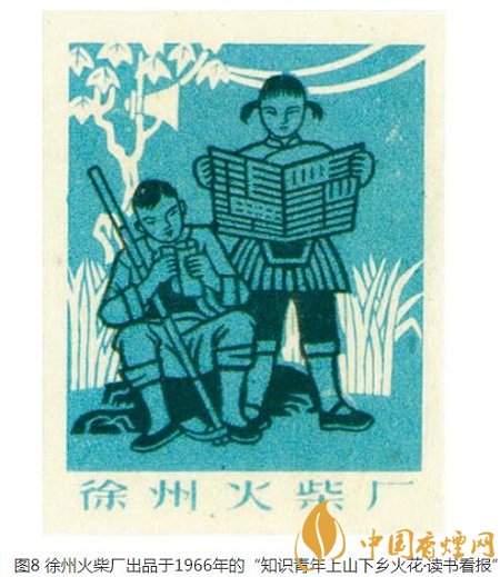 徐州火柴廠出品于同年的四枚/套的“知識青年上山下鄉(xiāng)”火花,“讀書看報”(圖8)一枚再現(xiàn)了一對知青利用休息間隙,在田間地頭讀書看報補充知識的畫面。