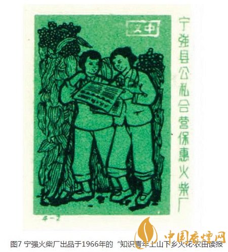 寧強火柴廠出品于同年的四枚/套的“知識青年上山下鄉(xiāng)”火花,其中“農(nóng)田讀報”(圖7)一枚,反映了兩名下鄉(xiāng)女知青在生長茂盛的農(nóng)田地頭捧讀《人民日報》,藉以尋求怎樣讓農(nóng)田獲得高產(chǎn)的良策。