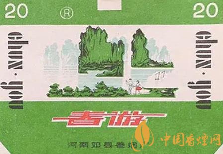 上世紀(jì)80年代,河南鄧縣卷煙廠出品的“春游”煙標(biāo),主版展現(xiàn)了山巒疊翠、水波蕩漾、帆影點(diǎn)點(diǎn)的迷人風(fēng)光,在這美景中,兩個(gè)人手牽著手走在綠草如茵的岸邊,其中一個(gè)女孩身穿紅裙,為滿目的綠增添了一抹亮色,另一個(gè)人伸手指著前方,似乎正在指引伙伴欣賞這美麗的湖光山色。