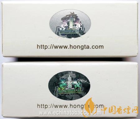 背面商標紙印刷工藝差異對比:真品商標紙采用白卡紙,凹印印刷,“Hongtashan”字體用手摸沒有凹凸感,“紅塔”左邊上下兩朵云距離塔身較遠;假煙采用高清掃描仿制印刷,“Hongtashan”字體用手摸有凹凸感,“紅塔”左邊上下兩朵云離塔較近,與真品特征存在明顯差異。